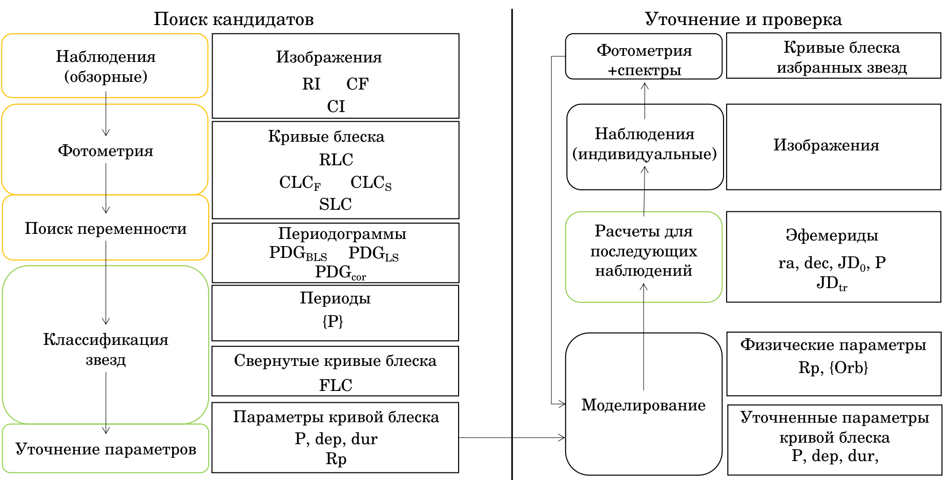 В течение длительного времени наблюдается одна площадка на небесной сфере каждую ночь. Полученные изображения обрабатываются, в результате чего создаются кривые блеска десятков тысяч звезд. Эти кривые блеска далее исследуются с целью поиска переменных звезд. Из найденных затменных переменных звезд отбираются те, затмения которых могут быть вызваны прохождением экзопланет. Для этого определяются параметры кривой блеска (период, глубина и падения блеска), на основе чего оценивается радиус и орбитальные параметры затмевающего тела. А также рассчитываются эпохи последующих транзитов для наблюдений.